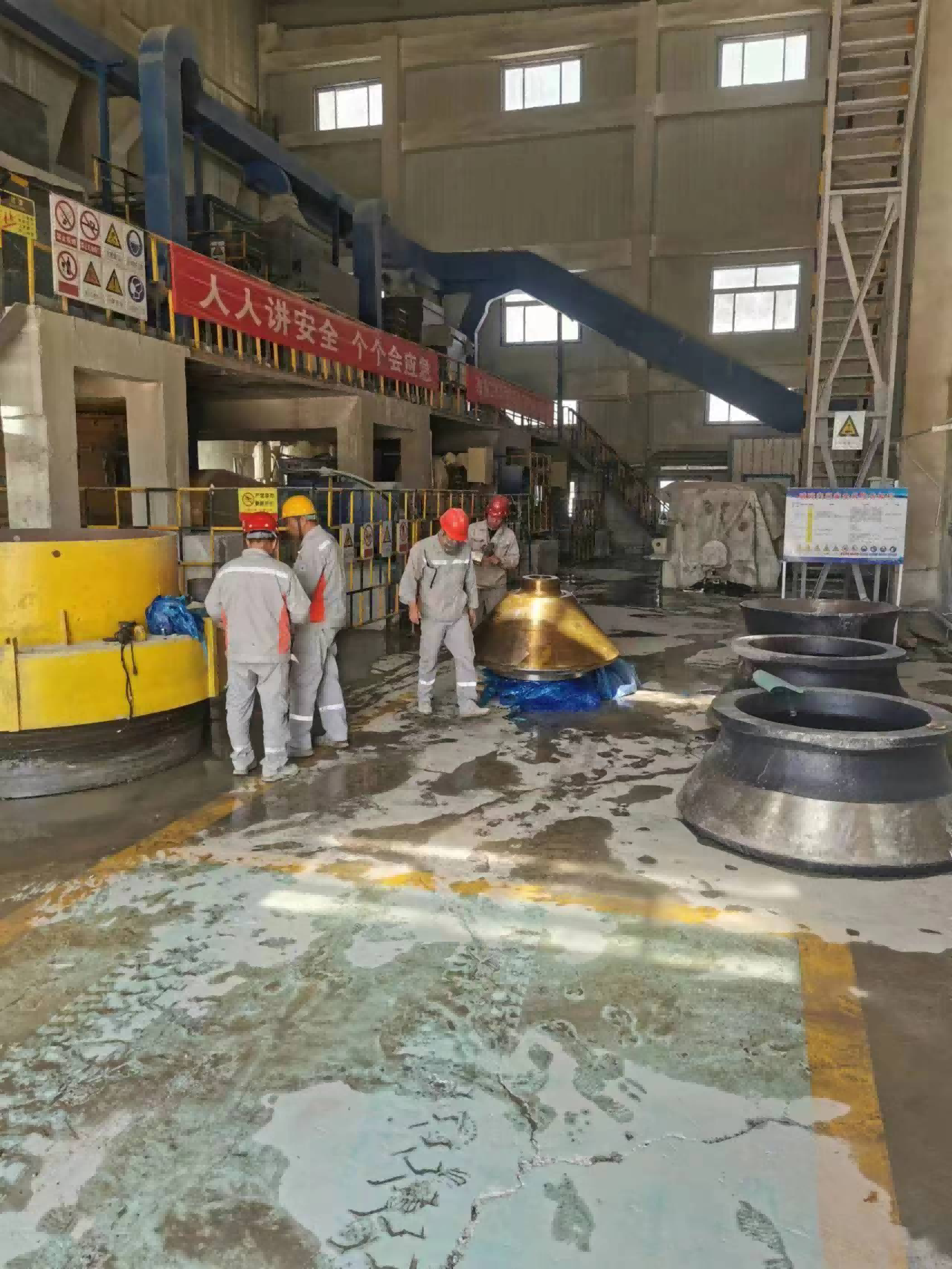 我們首先對設備進行了全面的檢查,在到達現(xiàn)場后,我們觀察了設備的運行情況。經(jīng)過檢查,我們確定了需要更換2號細碎動錐總成并安裝新襯板的需求。于上午9點開始拆卸2號細碎設備,更換襯板、潤滑油及動錐總成,并在中午1點完成更換工作。隨后,我們進行了帶料磨合,排礦口調(diào)整至23mm,電流控制在21A,帶料運行2小時,溫度最高48℃,壓力230bar,數(shù)據(jù)正常。在此過程中,我們嚴格按照操作規(guī)程進行操作,確保設備維護的質(zhì)量和效果。
