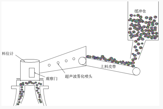 因破碎時(shí)產(chǎn)生粉塵過大,多數(shù)現(xiàn)場采用直接水管噴淋的方式降低粉塵的數(shù)量,卻導(dǎo)致給料過濕,從而減少破碎產(chǎn)能,并且對(duì)設(shè)備正常工作性能同樣也產(chǎn)生較大影響。