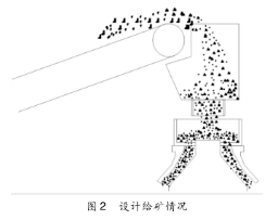 在原給礦膠帶機(jī)頭安裝一緩沖料斗,物料經(jīng)料斗緩沖后,正對(duì)分料盤,既解決了物料布料不均出現(xiàn)偏析的問題,又降低了現(xiàn)場揚(yáng)塵,設(shè)計(jì)給礦結(jié)構(gòu)見圖2。該給料斗可根據(jù)不同型號(hào)、不同給礦粒度選擇不同尺寸。
